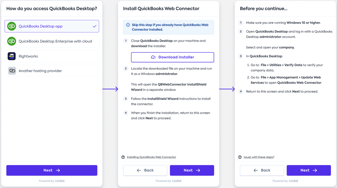 We have revised and improved the connectionConnection A link between a Codat company and a data source (like an accounting platform). Each connection represents authorized access to pull or push data from that platform. flows a small business customer goes through when connecting NetSuite, Sage Intacct, and QuickBooks Desktop. We have added: